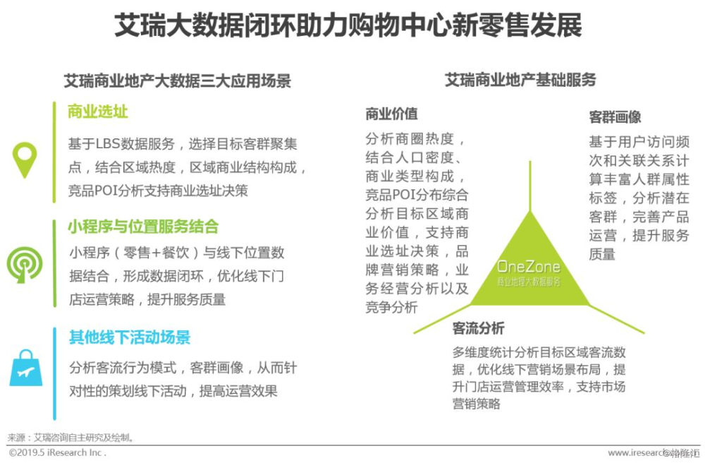 艾瑞自主研发的商业地理大数据服务产品OneZone将线上数据与线下场景活动数据相结合,以数据X技术的方法,实现消费者行为全流程、全触点在线,打通融合全渠道数据,增强消费者体验,数据闭环助力购物中心新零售转型。
