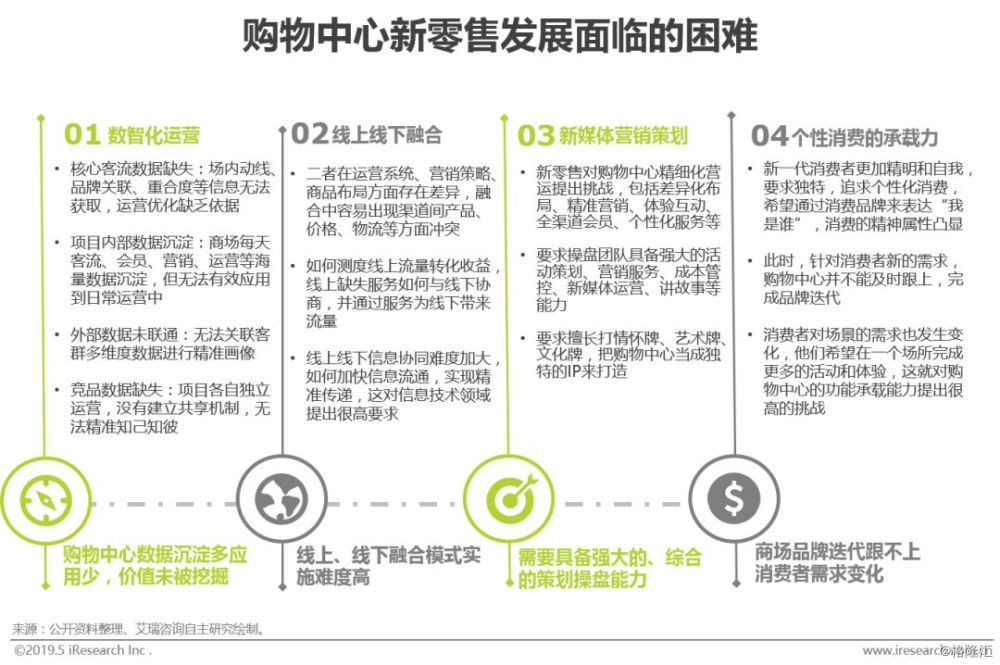 新消费主张及消费动能的出现对购物中心综合营运能力提出严峻挑战,购物中心新零售发展面临的困难主要体现在如下四个方面: