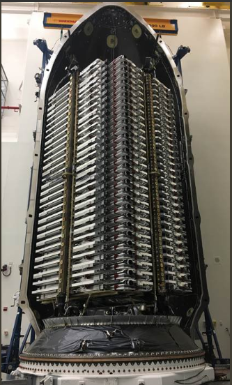 此次发射的60颗卫星在猎鹰9号火箭内紧密排列,图片来自马斯克社交媒体