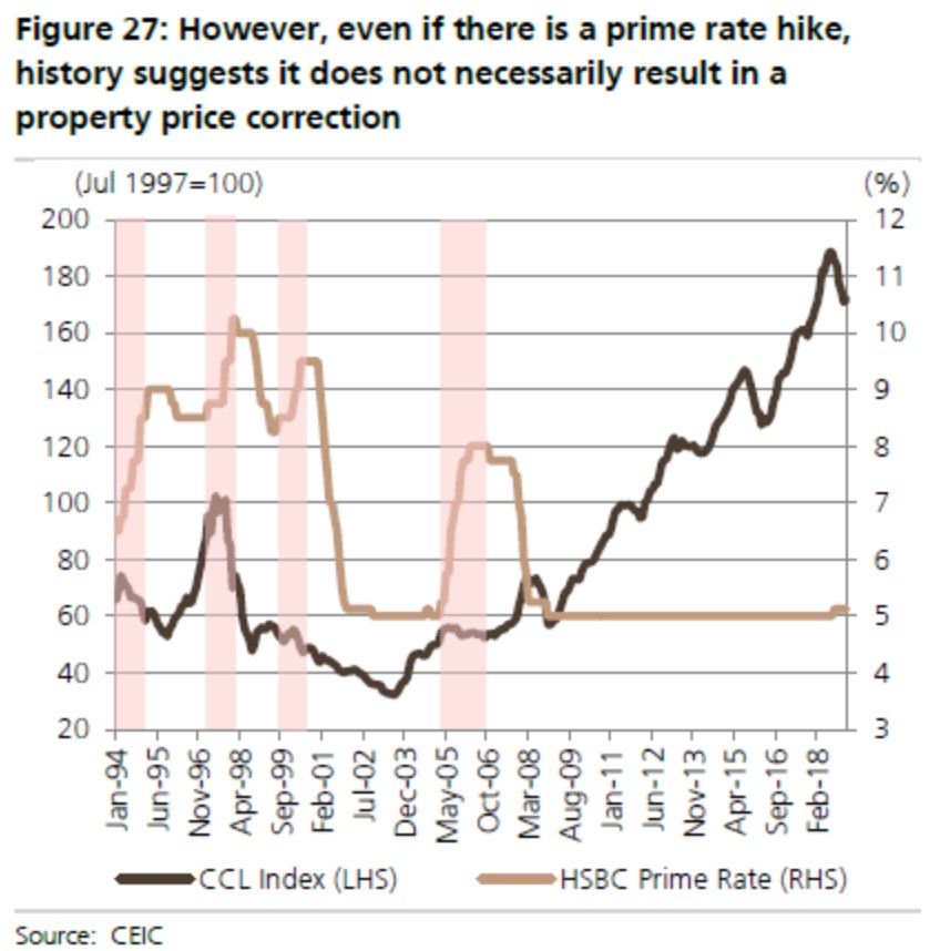不过,从历史经验来看,当利率上升时,CCL指标未必出现下滑,因为诸如住房供给、需求和就业市场前景等因素都会对房价造成巨大影响。尽管香港房价自2018年7月以来已向下调整了5%,但瑞银认为,这主要是受宏观经济的不确定性以及股票市场的下跌影响,而非因为利率上升。相反,最优惠利率仍处于历史低位,且利率上升仅0.125%的幅度几乎可忽略不计。