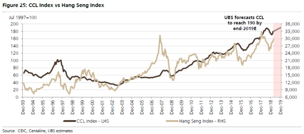 尽管中原城市领先指数(Centa-City Leading Index,简称CCL指标)自2018年7月以来已下跌了5%,主要是近期股市表现稳定的影响。不过,瑞银认为,CCL指标已经触底回升,并将于2019年底达到190的目标位,距离当前180的位置尚有5%的上升空间。