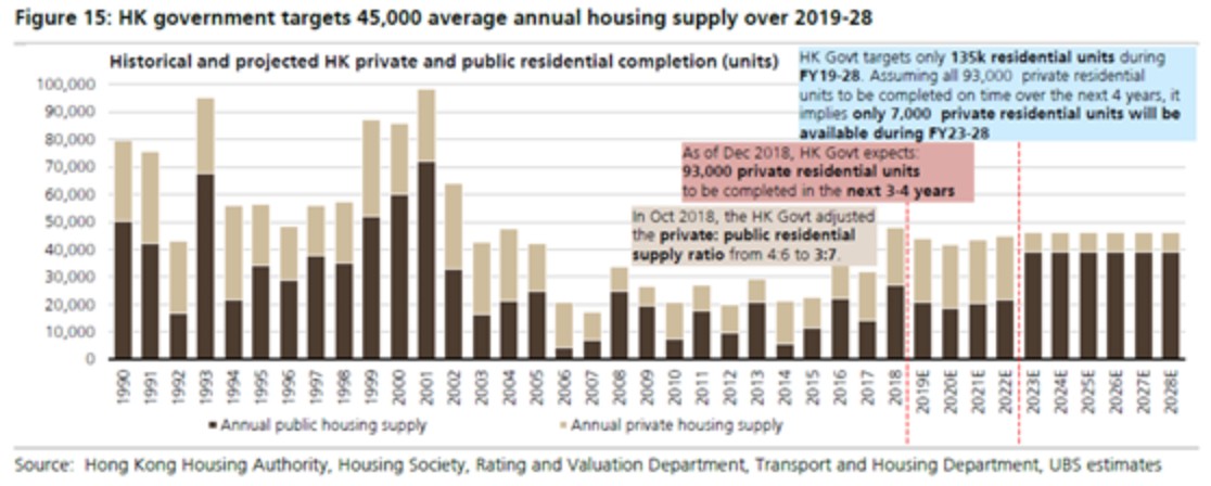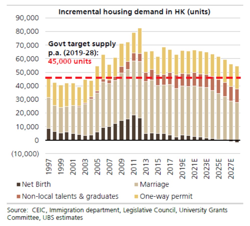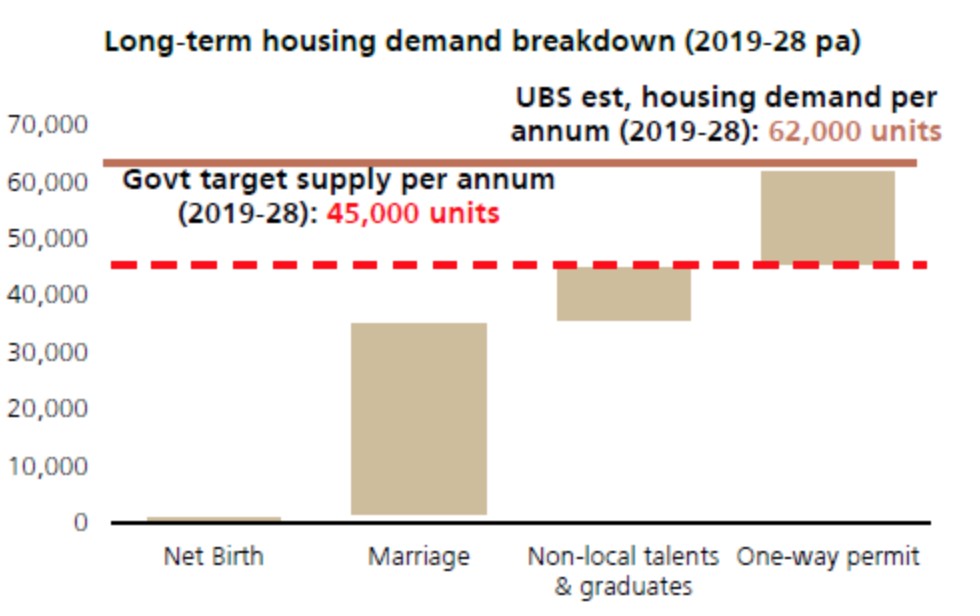 基于人口统计学,瑞银分析了香港的楼市需求。分析认为,香港每年的住房需求达到6.2万单元/年,相比于政府长期供给目标的4.5万单元,该需求主要还是受到非居民住房需求的支撑。