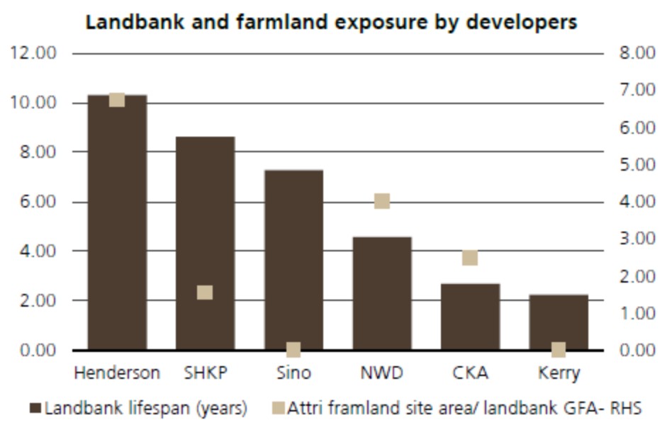 在主要开发商中,瑞银认为,恒基兆业(Henderson)、新鸿基地产(SHKP)和新世界发展公司(NWD)将成为本次房价升值周期的主要受益者。基于两个原因:(1)土地储备的有效期较长;(2)大量的农业用地储备。