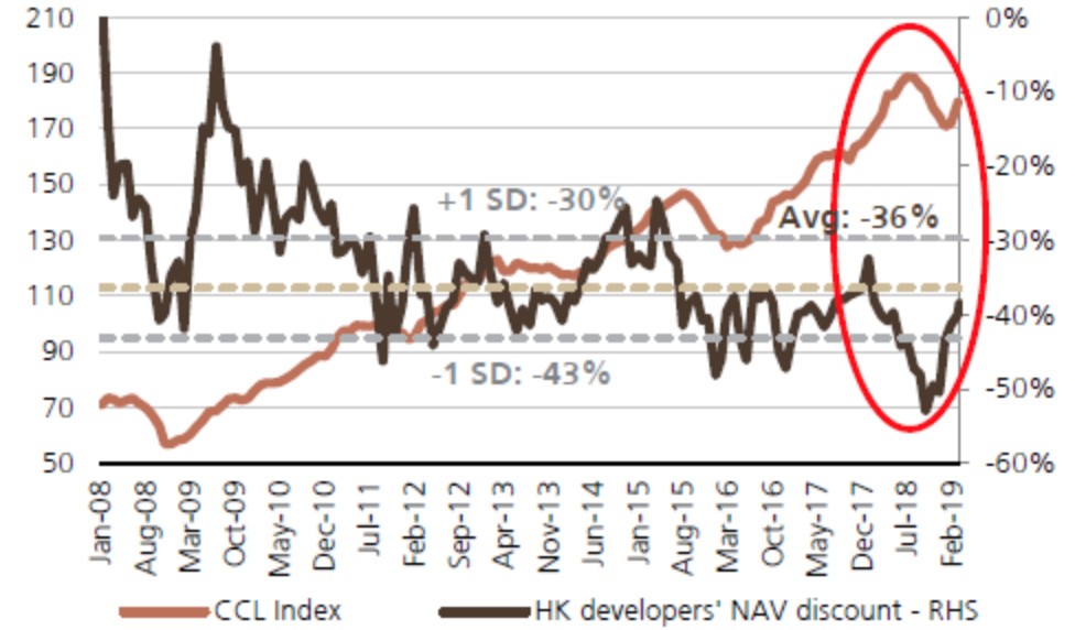 瑞银指出,当前开发商的净资产贴水状况(NAV discount)平均在40%左右,位于10年间(2008-2018年)平均水平的35%上方。