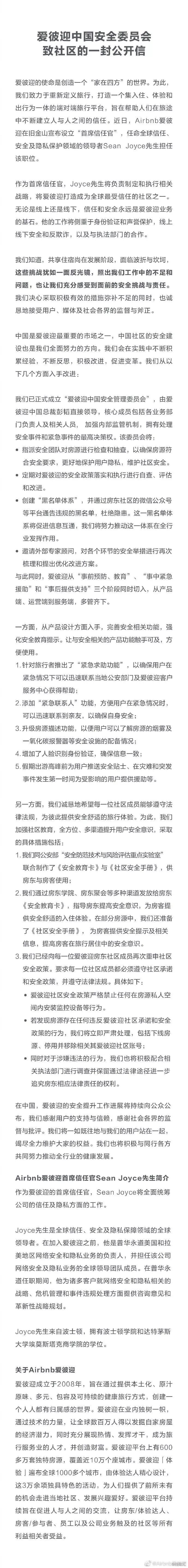 在事件发生之后,爱彼迎官方成立了“爱彼迎中国安全管理委员会”,由爱彼迎中国总裁彭韬直接领导。与此同时,爱彼迎全球设立了“首席信任官”一职,以解决平台上出现的各种信任问题。