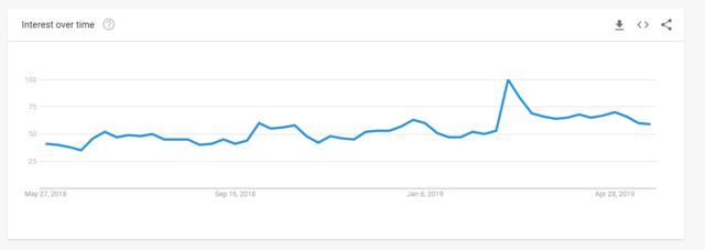 按谷歌的搜索热度统计,搜索“特斯拉Model 3”的数量在经历年初前几个月的下滑后,过去几周有大幅回升,3月初热度达到顶峰,与电动车网站Inside EV的报道的时间节点一致,该网站数据显示3月Model 3销售从5750辆大增至10175辆。当前热度水平尽管有所下滑,但仍比18年大多数时候要高,意味着Model 3需求仍然可观。