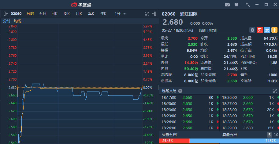 浦江国际暗盘收报2.68港元,与发行价持平,成交额173万港元,总市值为21.44亿港元。