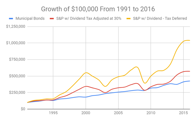We've talked briefly about the average returns of the S&P 500 versus municipal bonds. To revisit those, the average return of the S&P with dividends is 11.45% while municipal bonds averaged 6.03% during the same time period. To rely on the average return to make decisions is misleading. That is because the average return doesn't consider volatility into its returns. For example, if a person loses 10 percent one year and makes 10 percent back the next year, the average return is 0 percent, but they're annualized return is still negative. This demonstrates how the average return can be misleading. That said, the annualized return of the S&P 500 with dividends from 1991 to 2016 is 9.90% while the municipal bonds return is 5.9%. That is almost a four percentage point difference over the course of 25 years. At this point, it seems like a no brainer that a person would invest in the S&P over municipal bonds every single time.