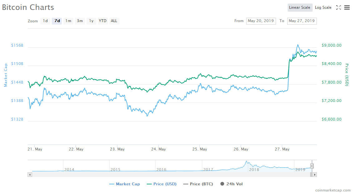 5月27日,全球币价网站CoinMarketCap数据显示,比特币在早盘间强势突破至8858.53美元,日内最大涨幅9.62%,总市值逾1500亿美元。在比特币行情的带动下,其余主流币普遍跟涨,市值排在前5位的数字货币24小时涨幅均超过7%。