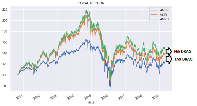 We can see that both fund vehicles (MLPI and AMLP) lag the index. MLPI is an ETN and so can hold more than 25% MLPs without being liable for taxes. Because the ETN does not have tracking error relative to the index, the difference in performance between it and the index is just the ETN fee.