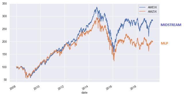 Even relative to the larger midstream space (roughly double the MLP space), MLPs have consistently underperformed.
