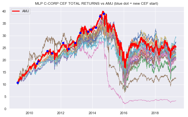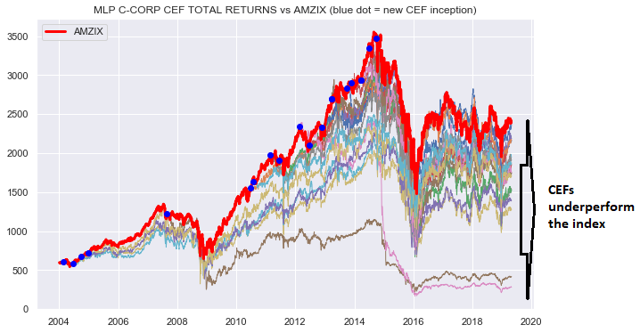 To see how C-Corp CEFs have performed, we compare their total price returns to AMZI - the Alerian MLP Infrastructure Index (as recommended by Alerian over AMZ) with the ticker AMZIX representing the total return of AMZI. The chart below is quite busy but conceptually simple. The red line is the Alerian MLP Infrastructure total return index. The thinner colored lines are the C-Corp CEFs with the blue dots representing the CEF inception dates which are when they are attached to the index and move in accordance with their total returns.