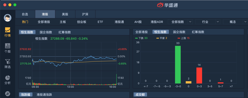 恒指早盘跌0.42%,报27239.08点。截至收盘,恒生指数跌65.84点或0.24%,报27288.09点,全日成交额达738.82亿。国企指数跌0.41%,报10402.76点,红筹指数跌0.11%,报4268.01点。热门板块方面,半导体板块随A股集体大涨。截止收盘,中芯国际涨10.1%,报9.27港元,全日成交额达7.64亿。华虹半导体涨5.85%,ASM太平洋涨2.25%。