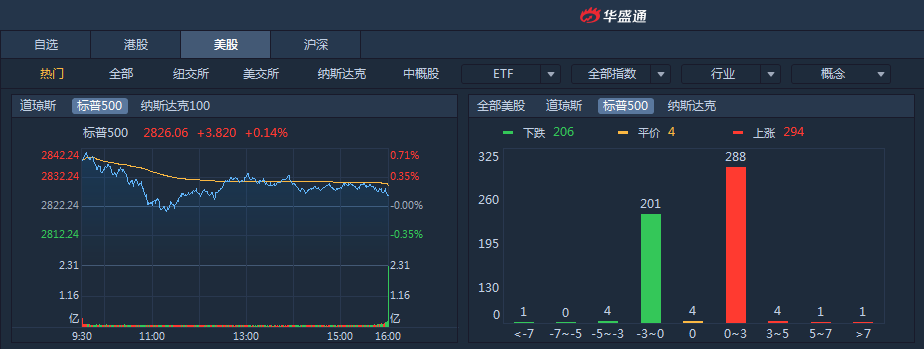 上周五,在连续下跌后,标普500指数收涨0.14%,报2826.06点。道琼斯工业平均指数涨幅0.37%,报25585.69点。纳斯达克综合指数收涨0.11%,报7637.01点。