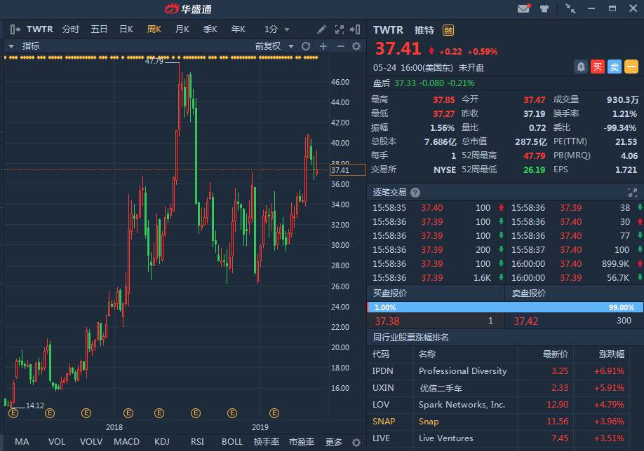 除了基本面及机构动向,技术面分析也反映当前的利好趋势。20月均线从15年至17年的下行趋势转为上升趋势,在最近期的2018Q4股价有明显支撑。关注近期走势的话,从周线图及日线图看,40周均线高于上周水平,若能保住近11个月32美元的底位的话,将被视为长期利好。日线图中,股价在36美元至41美元的位置形成箱体震荡,突破41美元将是再走强的一个标志。