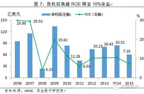 受全球经济弱复苏和监管趋严的影响,高盛近年来面临较大的增长压力。盈利能力明显下降,营业收入缓慢增长,资产负债规模的停滞不前。以2015年为例,高盛实现营业收入338亿美元,同比下降2%,净利润约61亿美元,同比下降约28%,ROE更是首次跌破两位数,降至7.14%的水平,其中机构客户服务和投资借贷是业绩下滑的主要业务点。据最新的财务数据,高盛2016年上半年营收为142.7亿美元,同比下降27.51%;净利润下降24%,至29.6亿美元。受制于去杠杆和盈利能力下降,高盛股价估值出现了明显下滑,相比危机前,PE估值和PB估值均下降70%以上。