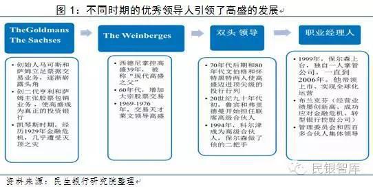 数位不同时期优秀的领导人引导了高盛的发展。西德尼之后是莱文。1976年,莱文去世后,公司管理委员会决定由文伯格和怀特黑特两人共同作为高盛产业的继承者,开创了闻名业界的“双头管理”时代。在二人的通力合作下,高盛于70年代主导了机构大宗交易,80年代主导了固定收益业务和杠杆收购。到90年代,在鲁宾和弗里德曼、科尔津和保尔森等卓越领导人相继带领下,高盛逐渐成为享誉全球并持续保持领先地位的金融企业。在成长为顶尖投行的过程中,高盛业务经营的一个显著特点是逐渐突破传统投行的业务边界,开启多元化发展,其标志性事件是1981年通过收购J·阿朗公司进入大宗商品交易领域,该项收购使交易业务对高盛营收和利润的贡献持续达30%以上;90年代,高盛又开设资本投资业务,成立GS资本合作投资基金,引领了投行业直接投资业务的发展。