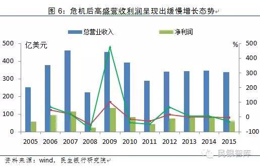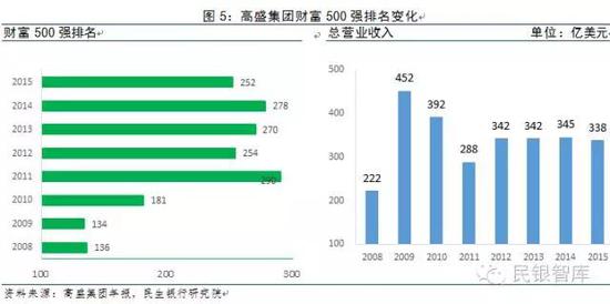 金融危机在很大程度上改变了国际投行业的发展轨迹。高盛集团的经营数据,也从侧面表明全球投行业与全球经济一样正在经历经济低迷、调整和适应期。根据财富500强榜单(以总收入规模计),高盛2009-2016年排名有所下滑,但2011年后相对平稳。