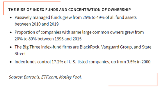 指数基金会导致股票所有权高度集中,削弱了企业之间进行竞争的动力。如果可口可乐和百事可乐等传统竞争对手因为出现指数基金而由同一个股东持有,那么这两家饮料生产商在饮料市场上争夺更大市场份额的理由就不那么充分了。竞争的动机越少,创新的动机也会越少,从长远来看,这对消费者和投资者都是不利的。