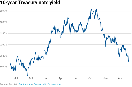 “自去年12月底触底以来,标准普尔500指数的回报率为20.2%,而10年期美国国债收益率则从2.74%跌至2.32%。简单的数学计算就可以得出,国债收益率下降有助于股价的上涨。然而,更全面的分析对这种共识提出了挑战。”