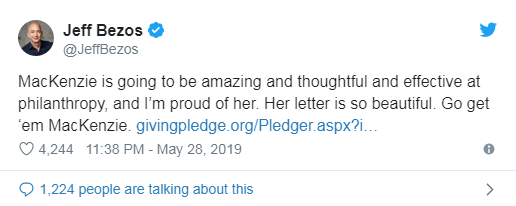 贝佐斯也发推称赞了他前妻的决定。他在推特上说:“麦肯齐将会在慈善事业上表现得令人惊叹、深思熟虑、卓有成效,我为她感到骄傲。”