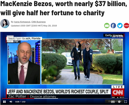 今天,身价370亿美元麦肯齐-贝佐斯(MacKenzie Bezos)承诺将至少一半的财产捐给慈善机构,总价值约185亿美元。就在几个月前,她刚刚与世界首富、亚马逊创始人杰夫-贝佐斯离婚。