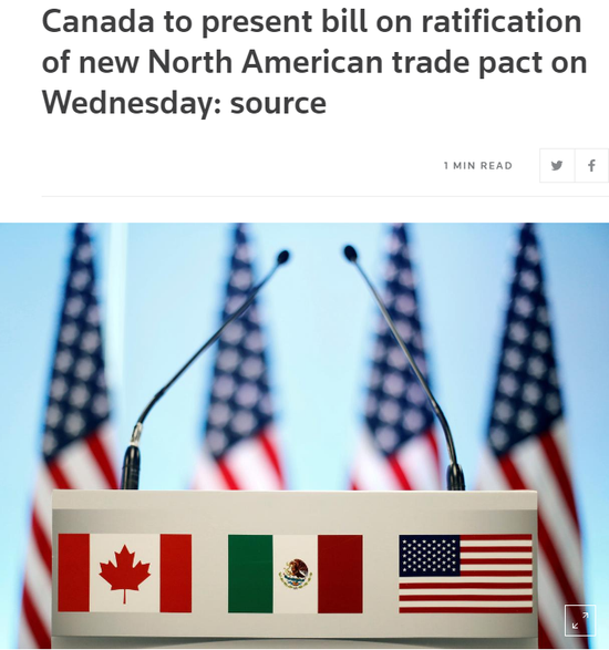 昨天,消息称,特鲁多政府发出通知 向批准新北美自贸协定迈出一步,加拿大总理贾斯廷-特鲁多政府正式通知议员,它打算提出立法来批准新的北美自由贸易协定。