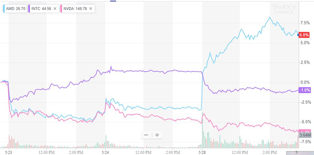 英特尔盘中最大跌幅2.8%,收跌2.24%,报收43.57美元,创5月20日以来最低,但接近2018年10月24日以来最低。与AMD在GPU显卡领域直接竞争的英伟达最深跌1.3%,收跌1.25%,报收143.33美元,创2019年1月30日以来最低。
