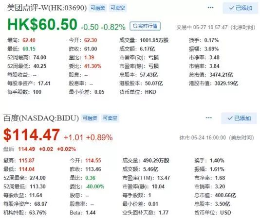 5月17日上午,在百度公布了2019年一季度未经审计的财务报告之后,百度股价开盘暴跌逾15%,随后扩大至16%,市值最低时仅450亿美元,美团点评盘中涨逾3%,市值3552亿港元(约合452亿美元)。而两者之间市值的差值,在5月23日晚间,美团点评的一季度业绩发布之后,持续扩大。