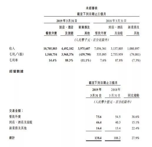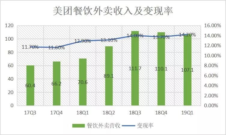 根据财报解释,收入增长的原因在于,本季度餐饮外卖订单量由2018年同期的12亿笔增至17亿笔,同比增长35.8%。同时,每笔餐饮外卖业务订单平均价值同比增长2.1%,餐饮外卖变现率由12.9%同比上升至14.2%。