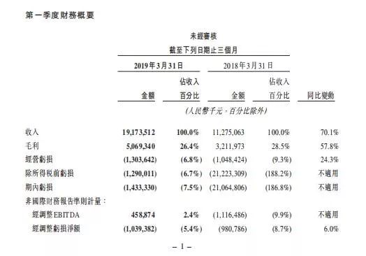 根据美团2019年第一季度财报,总营收191.7亿元人民币,同比增长70.1%;毛利润50.7亿元,同比增长57.8%;经营亏损13亿元,同比增长24.3%,但经营亏损率大幅收窄至6.8%;经调整EBITDA为4.6亿元,首次扭亏为盈。