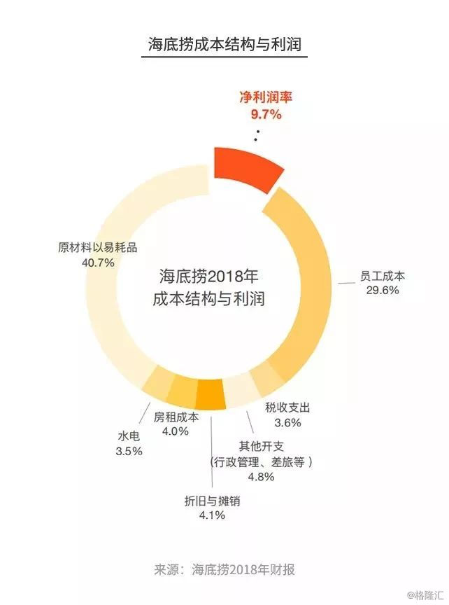 在海底捞的成本结构中,员工成本占到29.6%。而一般的火锅店人工成本会控制在15%—20%。海底捞一家店员工人数在150人左右,光员工住宿成本,一家店一年就高达50万。而一般一家1000平米的火锅店,员工人数只有三五十人。