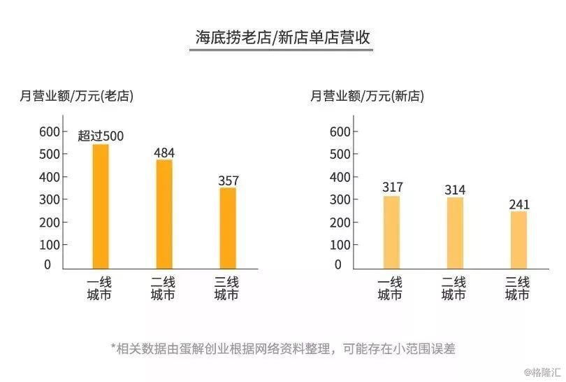 根据财报数据计算,2018年一线城市同店(经营超过360天的店,全国共145家),单店平均月营业额超过500万元;二线城市484万;三线及以下城市的是357万。算上新店(一共430家),单店月营收额一线城市317万;二线城市314万;三线及以下城市241万。