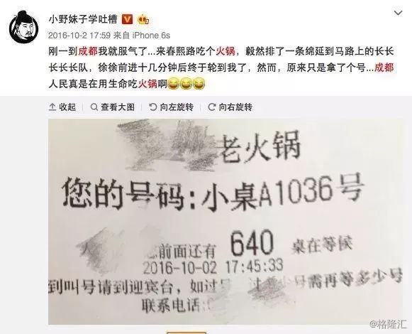 “排队难,难于上青天”“外地人到成都必打卡火锅店”“朋友圈炫耀神器”… 小龙坎火锅创造的排队神话,一点都不亚于茶饮届的喜茶。其中,微博著名大V“小野妹子学吐槽”的两次小龙坎经历也是不忍直视。