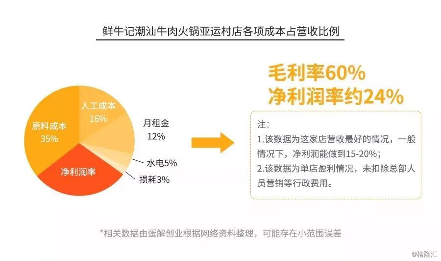 3、对供应链要求很高。牛肉火锅吃的是鲜,要求当天宰杀,不冷冻,6小时内送到餐桌上,配送是一个问题。在潮汕,很多牛肉火锅店直接开在屠宰场附近。牛肉火锅对肉的部位也有要求,一只牛只有37%的肉适合涮火锅,余下的部分如何处理是个难题。这些都很考验对供应链的把控能力。而且很多新增门店多是单店,单店采购,对供应链的议价能力很弱。