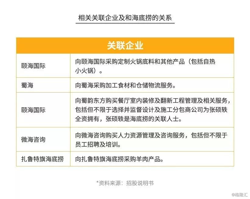 海底捞涉足了整个火锅产业链的上游,包括食材供应、底料供应、人力资源、装修等,每一环节都成立了公司独立运作。并且这些供应链公司都对外开放,向其他公司提供服务,海底捞餐厅只是供应链公司合作方之一。比如火锅底料供应商颐海国际,早于海底捞在港股上市,颐海国际只有50%的收入来自于海底捞关联交易。