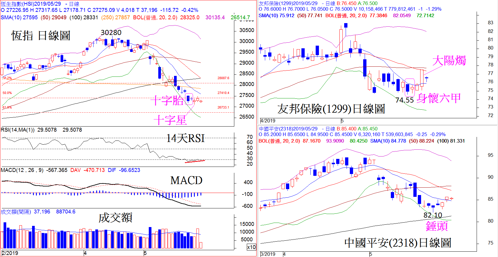 至於平保方面,其股價於5月23日以「錘頭」在82.10元見底,之後逐步回升,昨日更以細陽燭確切升穿了10天平均線阻力85.00元高收,正式扭轉了之前的單邊跌勢,只要繼續守在10天平均線後抽支持84.70元之上,後市就可以挑戰20天及50天平均線阻力區87.20至88.20元。