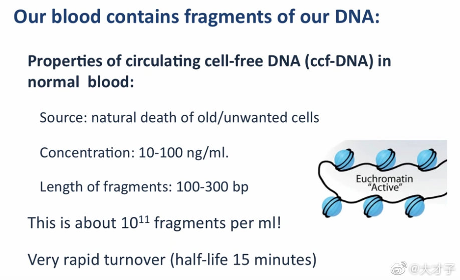 首先,什么是Free-cell DNA呢?就是在血液中循环的DNA片段,我们可以直接通过抽血获得,对这些DNA分析,目前有以下几种主要临床上的应用: