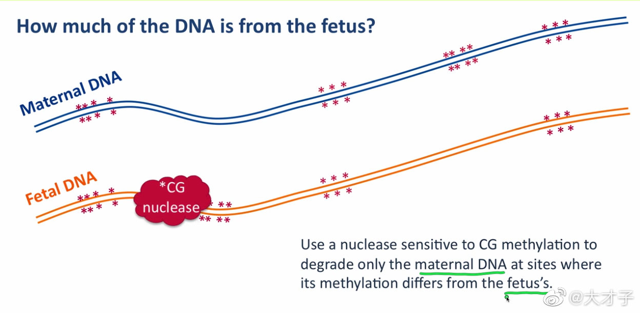 当女人怀孕,她们的血液中不但含有自己的DNA,也含有胎儿的DNA,大多数的胎儿DNA来自于他们的胎盘,随着胎儿的成长,母亲体内的胎儿DNA碎片也会增长,然后通过使用对CG甲基化敏感的核酸酶,只降解母体DNA与胎儿不同的甲基化位点,可以把母亲的DNA和胎儿的区分开来,通过测试胎儿的DNA就可以知道胎儿的性别,还可以检测胎儿是否患有唐氏综合症和爱德华综合症这些遗传性疾病。用这种基因检测的方法,不断准确率有很大的提升,通常误诊率低于0.1%,而且无需做羊水穿刺,从而降低了胎儿被误伤的风险。这个技术也被称作是NIPT(non invasive prenatal testing)无创产前检查。