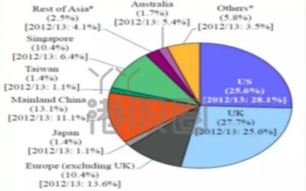 资金的来源地上,一直都是外资为主,其中大头是美国和英国,两者合计占比超过一半。