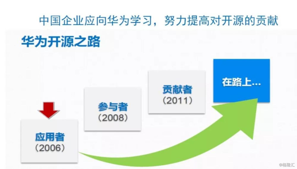 开源软件我们表扬一下华为公司,他们走过很多的路,从简单的应用到参与贡献到做出比较大的贡献,现在应该继续发展,在一些重要的设计计划当中起比较大的作用。比如华为在5.1版本补丁贡献世界第五。包括后面腾讯、阿里、百度以及三大运营商,都对开源软件有贡献。但是这个可能需要我们继续努力,扩展我们在开源设计的影响。