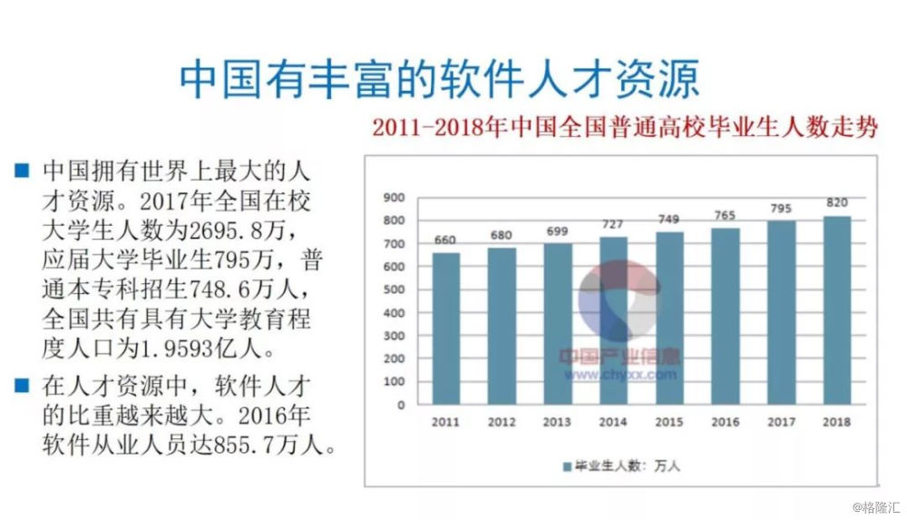 我们的人才资源是最大的优势,我们每年有795万人才投入市场,不光看学哪一个专业的,金融、管理的很大一块都学习软件。根据工信部的统计,2016年我国软件从业人员已经达到855万,仅次于美国。
