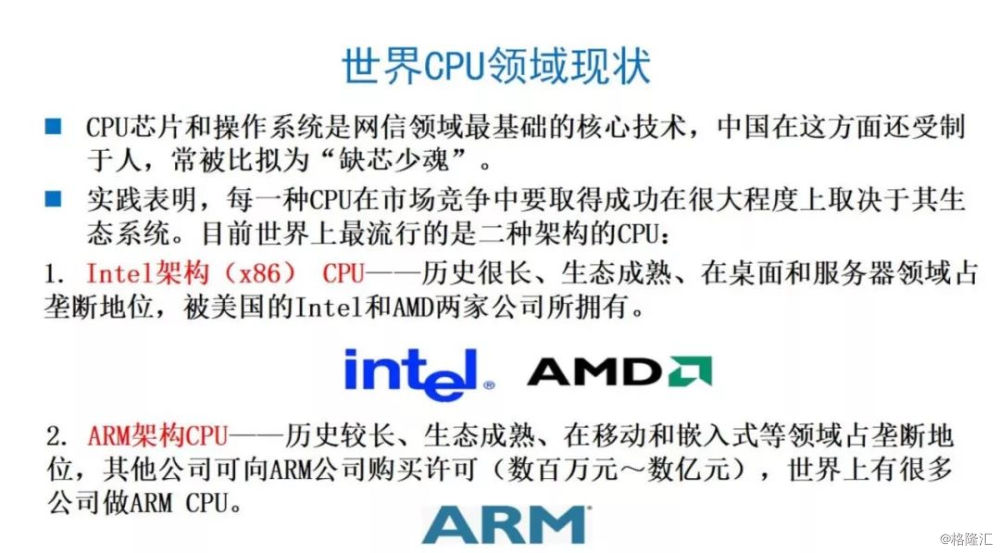我们现在世界上芯片影响最大的是英特尔,它历史最悠久、生态也很成熟,特别是在著名计算机领域、一些服务器领域是有优势的。第二个是ARM公司,全世界大量的公司、中国几十家都在ARM架构里面做的。像华为公司、国防科技大学都花了很多时间买授权。