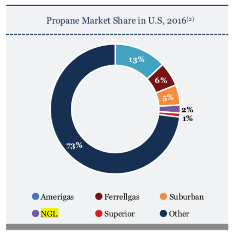 If AmeriGas were to continue to operate on its own, the company’s leveraged balance sheet will limit its growth. The propane delivery market is still quite fragmented, with over 4000 small or medium players that made up about 73% of the total market share (see chart below). This means that larger companies can take advantage of this opportunity by growing through acquisitions, provided they have a healthy balance sheet.