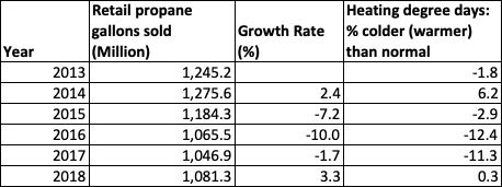 While some investors may argue that AmeriGas was trading close to an EV-to-EBITDA ratio of 12.0x a year ago, investors should understand that the propane delivery business is not a growing business in the United States. Even when the weather pattern was about 4% colder than normal in the past quarter, its volume declined by about 1.6% year over year. As can be seen from the table below, the company’s retail propane gallons sold has declined from 1.25 billion gallons in 2013 to only 1.08 billion gallons in 2018. This was a decline of 13.2% in 5 years.
