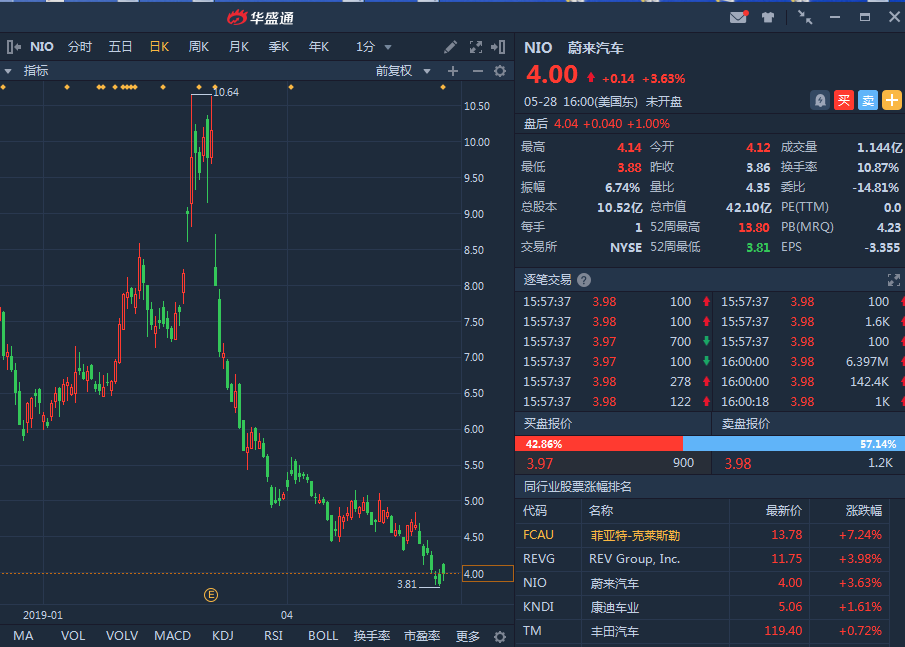 作为新造车势力第一股,蔚来昨日盘前公布的2019年Q1季报好于预期,但ES8交付量环比减半,股价盘前涨超3%,昨日收涨3.63%至4.00美元,盘后股价涨1%。