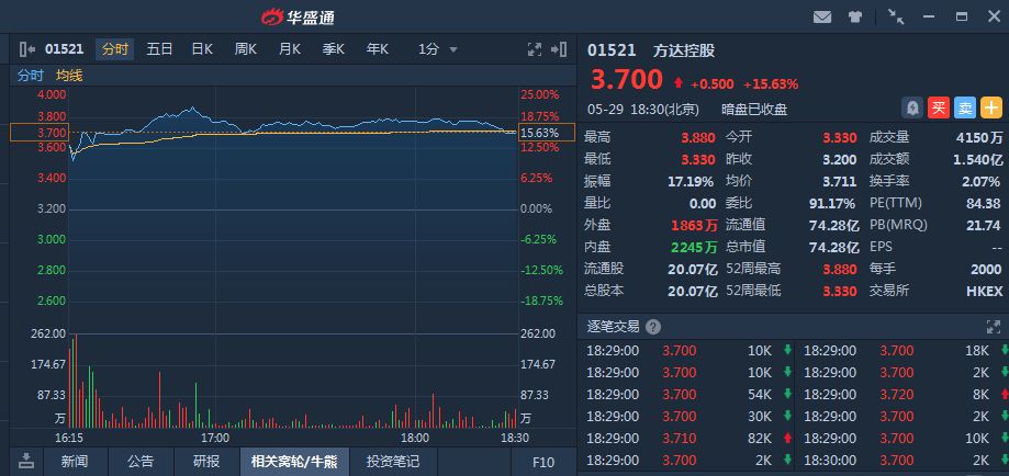 方达控股暗盘收报3.7港元,较发行价3.2港元涨15.63%,每手赚1000港元,成交额1.54亿港元,总市值为74.28亿港元。