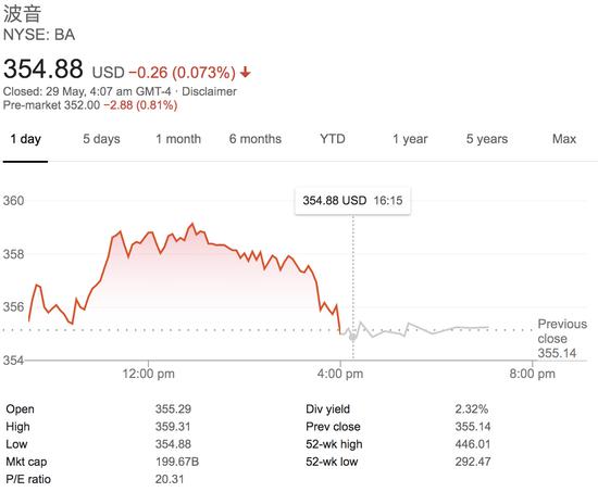 截至5月29日收盘,波音股价报354.88美元每股,跌0.073%。