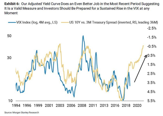 摩根士丹利警告称,经调整后的收益率曲线还预示股市波动率势将上升。过去几年,经调整后的美债收益率曲线基本可以视为对VIX指数走势的“神预言”。