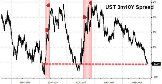 金融博客Zerohedge提到,3个月与10年期美债收益率曲线倒挂在过去50年里出现过六次,每一次都无可避免地发生了经济衰退,自这一信号出现后,平均311天衰退就到来了。彭博社早前报道称,这一收益率曲线倒挂幅度为负12个基点,是今年3月倒挂自2007年首次出现以来最低,说明现在市场的恐慌程度再创新高。